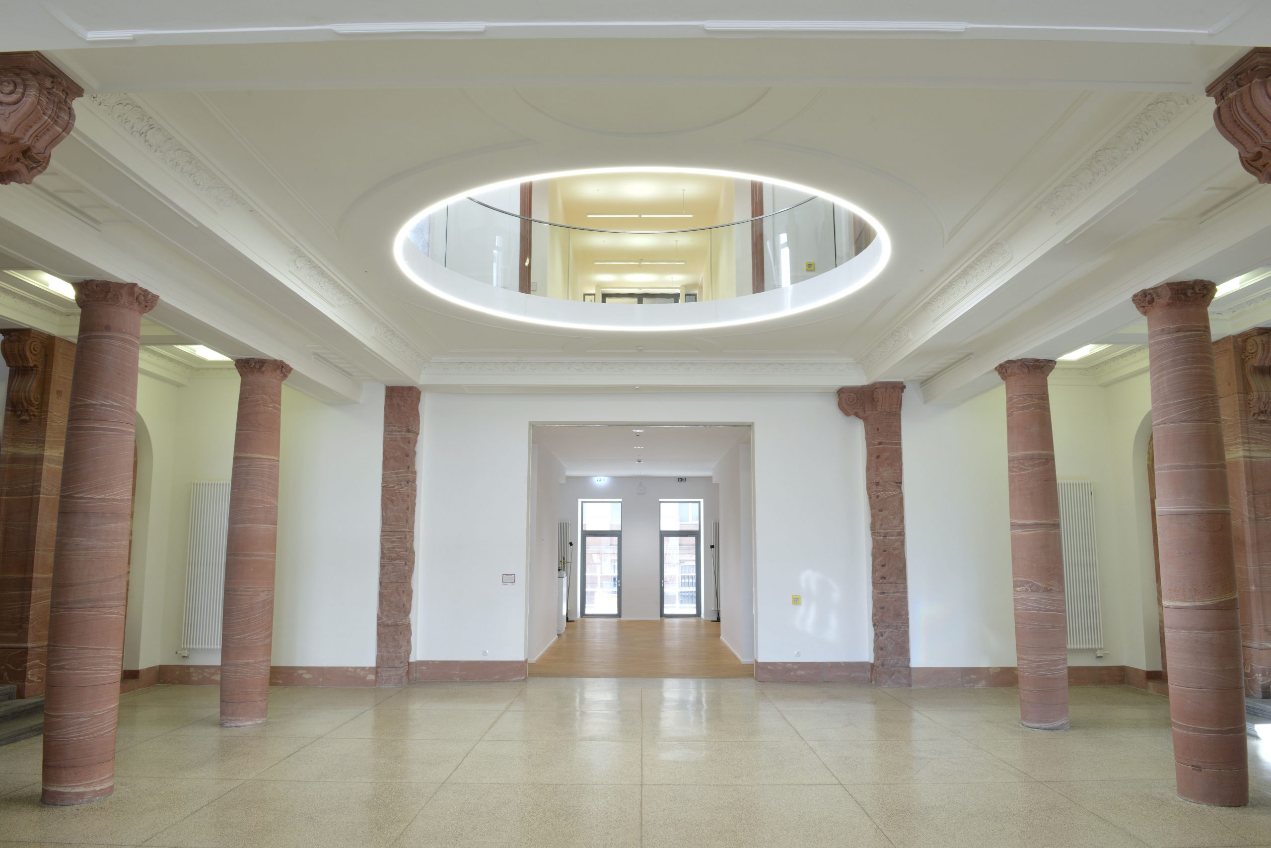 The Jügel House was built in 1906 in a neobaroque style. Prominent exterior and interior features of the building are composed of German Triassic red sandstone (Buntsandstein), excavated from quarries along the river Main about 80 km south of Frankfurt. Between 1914 and 2012 the Jügel House served as the main building for the Goethe University. Since 2014, when it was handed over to the Senckenberg Gesellschaft für Naturforschung, it has hosted the department of paleontology and historical geology.